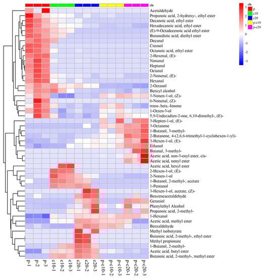 The CPPU treatments changed not only the volatile compositions but also the relative contents of some VOCs in comparison with the P group. The main compounds that were obviously altered are shown in the heatmap in Figure 3. Compared with the fruits of the P group, six VOCs were not detected in all the CPPU-treated fruits: acetaldehyde, (E)-2-hexenal, octanal, (Z)-6-nonenal, heptanal, and creosol. The results also demonstrated that the CPPU-treated fruits emitted some unique VOCs: for instance, acetic acid hexyl ester, and (E)-2-hexen-1-ol were only detected in the C10 fruits; and (Z)-3-hexen-1-ol acetate, methyl propionate, methyl isobutyrate, and 2-methyl-butanoic acid ethyl ester were only detected in the C20 groups. The P-C20 fruits emitted two unique VOCs (acetic acid nonyl ester and 3-methyl-butanal). The relative abundances of six VOCs derived from C10 and C20 were significantly higher than those in the other treatments and the control. The relative abundances of seven VOCs detected in the P-C10 and P-C20 groups increased in comparison with the other treatments and the control.