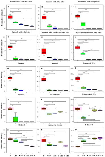 Box plot visualizations of the relative abundances of the VOCs that were markedly altered after CPPU treatment. (A–F) Esters, (G–J) aldehydes, (K–M) alcohols, and (N) trans beta ionone markedly declined after CPPU treatment. (O) 1-Hexanol markedly increased after CPPU treatment. For each box plot, the bottom and top of box indicate the 25th and 75th percentiles, respectively; the horizontal line inside the box is the median; the bottom and top error bars indicate the 10th and 90th percentiles, respectively; *, **, and ***, different groups had significant differences at the 0.05, 0.01, and 0.001 levels, respectively.