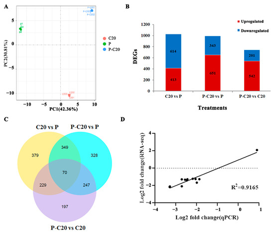 DEGSeq2 software identified 743 to 1027 DEGs (p < 0.05 and fold change > 1) among the three different libraries (P, C20, and P-C20). The greatest numbers of DEGs (614 down- and 413 upregulated genes) were found between C20 and P. A total of 651 up- and 343 downregulated DEGs were identified between the P-C20 and P libraries. Lastly, 542 up- and 201 downregulated DEGs were obtained between the P-C20 and C20 libraries (Figure 5B). Only a small number of common genes (70) was found among the three treatments (Figure 5C). The reliability of the RNA-Seq analysis was confirmed by a qRT-PCR assay with twelve randomly selected DEGs; the qRT-PCR analysis showed high consistency with the DEG data resulting from the RNA-Seq assay (Figure S1), and a strong correlation (R2 = 0.9165) was observed between the results obtained with the two techniques (Figure 5D).