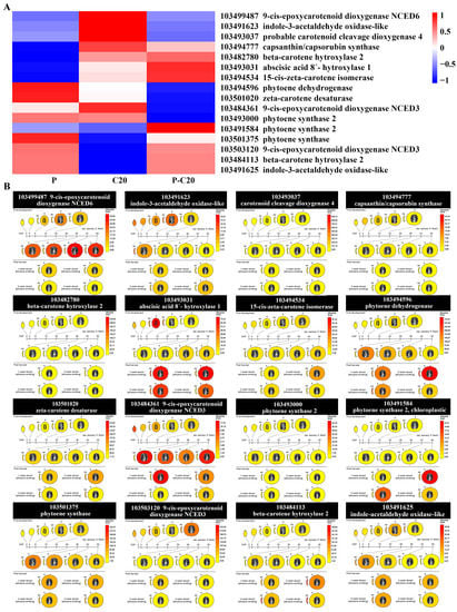 Since the sensorial quality parameters significantly altered by CPPU treatment included the accumulation of carotenoid-like pigment, the expression pattern of DEGs that were potentially associated with biosynthesis of these compounds were analyzed in detail. As shown in Figure 6A, the DEGs related to carotenoid synthesis, such as indole-3-acetaldehyde oxidase-like (ID: 103491625), beta-carotene hydroxylase 2 (ID: 103484113), phytoene synthase (ID: 103501375), and phytoene synthase 2 (ID: 103491584), were downregulated in the C20 group on average in comparison with the P and P-C20 groups. Additionally, some of the genes in this cluster were upregulated during melon fruit development maturation stages, as analyzed using the Melonet-DB tool based on the RNA-Seq data of the Earl’s favorite Harukei-3 melon cultivar (Figure 6B).