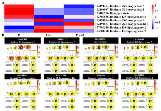 Fatty acid metabolism is one of the main pathways for the synthesis of aroma volatiles in most fruits, and lipoxygenase (LOX), alcohol dehydrogenase (ADH), and alcohol acyltransferase (AAT) are regarded as the primary enzymes in this process [34,35]. To illustrate the link between volatile compounds and related genes, we analyzed the DEGs related to the crucial enzymes (LOX, ADH, and AAT) in detail. As shown in Figure 7A, the DEGs related to LOX in the fatty acid metabolism pathway such as linoleate 9S-lipoxygenase 5 (103491403 and 103494917), lipoxygenase 6 (103488906), and linoleate 13S-lipoxygenase 3 (103500686) were upregulated in the P group compared with the C20 and P-C20 groups. Linoleate 9S-lipoxygenase 6 (103494864), and linoleate 13S-lipoxygenase 2 (107990336 and 103504290) were upregulated in the C20 group compared with the P and P-C20 groups. Linoleate 9S-lipoxygenase-like (103492581) was upregulated in the P-C20 group compared with the other two groups. In the Melonet-DB analysis, the LOX genes (103491403, 103494917, and 103488906), being upregulated in the P group, are highly expressed during fruit development and maturity of Earl’s favorite Harukei-3 melon cultivar, except gene 103500686. However, those LOX genes induced by C20 or P-C20 groups were not highly expressed during fruit development and maturity (103494864, 103492581, 107990336, and 103504290; Figure 7B).