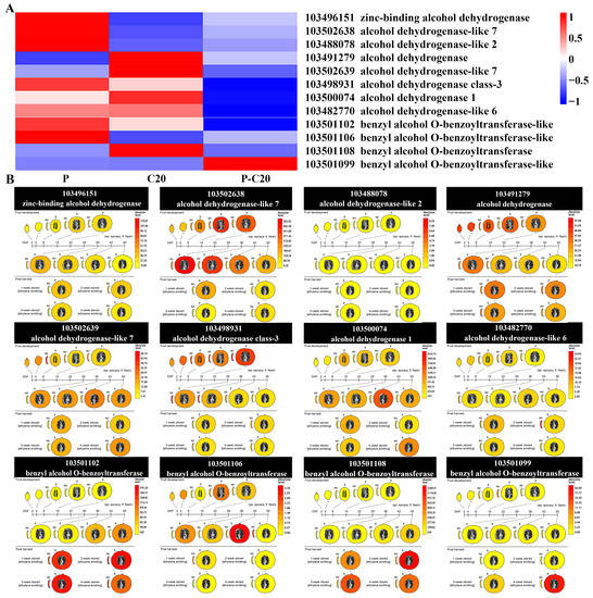 As shown in Figure 8A, the DEGs related to ADH in the fatty acid metabolism pathway, such as zinc-binding alcohol dehydrogenase (103496151), alcohol dehydrogenase-like 7 (103502638), and alcohol dehydrogenase-like 2 (103488078), were highly upregulated in the P group compared with the C20 and P-C20 groups. Alcohol dehydrogenase (103491279) and alcohol dehydrogenase-like 7 (103502639) were upregulated in the C20 group, but their expression levels were relatively lower in the P and P-C20 groups. Moreover, alcohol dehydrogenase class-3 (103498931), alcohol dehydrogenase 1 (103500074), and alcohol dehydrogenase-like 6 (103482770) were highly expressed in the melon fruit of the P and C20 groups, but downregulated in the P-C20 group. In the Melonet-DB analysis, all the induced ADH-related genes are highly expressed during fruit development or maturation of the Earl’s favorite Harukei-3 melon cultivar, with the exception of the alcohol dehydrogenase-like 2 (103488078) gene (Figure 8B).