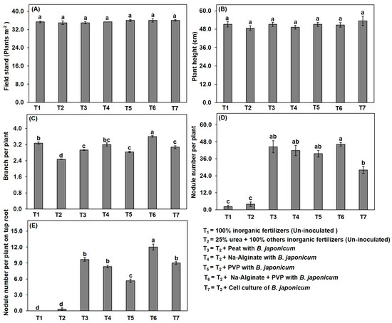 Effect of different carrier-based formulations of B. japonicum strain on soybean plant growth parameters and nodulation. (A) Field stand; (B) plant height; (C) branch per plant; (D) nodule number per plant; (E) nodule number per plant on tap root. Data are means ± SE (n = 5). Bars without shared letters indicate significant differences in treatments at p < 0.05.