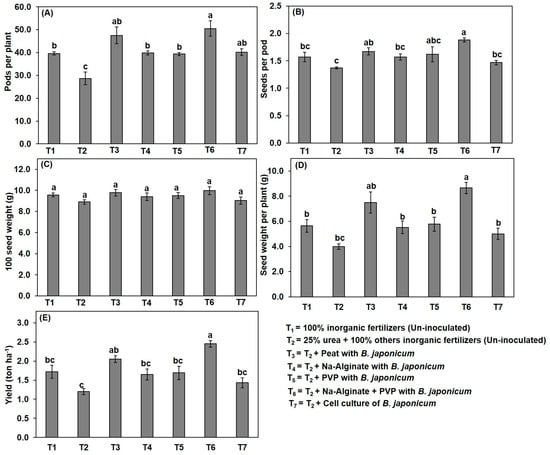 Effect of different carrier-based formulation of B. japonicum strain on soybean yield parameters. (A) Pods per plant; (B) seeds per pod (C) 100 seed weight; (D) seed weight per plant; (E) yield. Data are means ± SE (n = 5). Bars without shared letters indicate significant differences in treatments at p < 0.05.