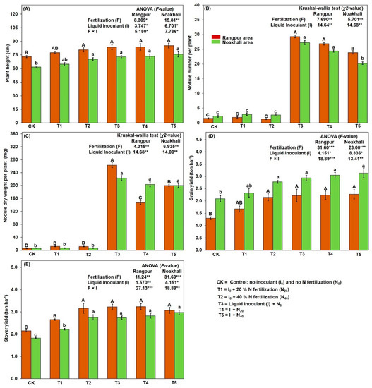 Effect of liquid inoculant (Na-alginate + PVP based) of B. japonicum and nitogen application on soybean growth and yield. Two-way ANOVA and Kruskal–Wallis tests illustrate the effect of fertilization (F) and liquid inoculum (I) on (A) plant height; (B) nodule number per plant; (C) nodule dry weight per plant; (D) grain yield; (E) stover yield of soybean (ns p ≥ 0.05, * p < 0.05, ** p < 0.01, *** p < 0.001). Data are means ± SE (n = 3). Bars without shared uppercase and lowercase letters indicate significant differences in different treatments in the Rangpur and Noakhali area at p < 0.05, respectively.