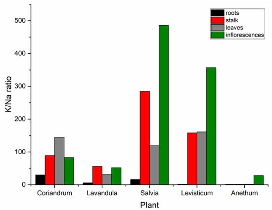 Among the five studied plant species, all except coriander have been reported to have diuretic properties [52,53,54,55]. To assess the diuretic activity of the plants, the K/Na ratio could be used. It was presented graphically in Figure 1. The values ranged between 1.1:1 for the roots of A. graveolens and 486:1 in inflorescences of S. sclarea, which is in good agreement with the findings reported by Zinicovscaia et al. [23] and Szentmihályi et al. [56].