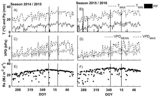Maximum daily temperature (TMAX), minimum daily temperature (TMIN), daily precipitation (PP) (A,B); average daily vapor pressure deficit (VPDMEAN), maximum daily vapor pressure deficit (VPDMAX) (C,D); and daily solar radiation (Rs) (E,F) measured in both seasons (2014/2015 and 2015/2016). Vertical thin lines indicate the period of application of irrigation treatments. DOY is the day of year.