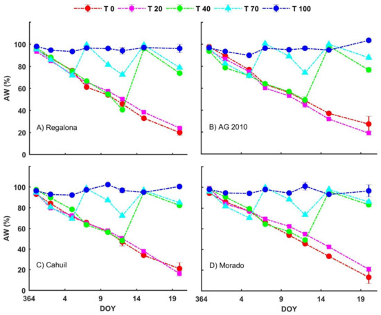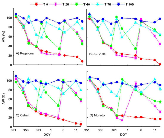 Evolution of available water (AW) in five irrigation treatments (T): T0, T20, T40, T70, and T100, and four quinoa genotypes: (A) Regalona, (B) AG 2010, (C) Cahuil, and (D) Morado, between the beginning of grain filling throughout the physiological maturity stages, in the 2015/2016 season. AW and 0, 20, 40, 70, and 100 represent the levels of available water to the plant in a 0.6 m deep root zone just before irrigation. DOY is the day of year. Bars indicate ± one standard error.