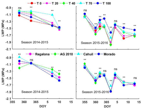 Leaf water potential (LWP) at midday under five irrigation treatments (T) and four quinoa genotypes, between the beginning of grain filling throughout the physiological maturity stages, in the 2014/2015 and 2015/2016 seasons. T0, T20, T40, T70, and T100 represent the levels of available water to the plant in a 0.6 m deep root zone just before irrigation. For water availability treatments, each point represents the average of 16 measurements, and for genotypes, each point represents the average of 20 measurements. DOY is the day of year. **, measurement date indicating that significant differences were found. ns, measurement date indicating that no significant differences were found.