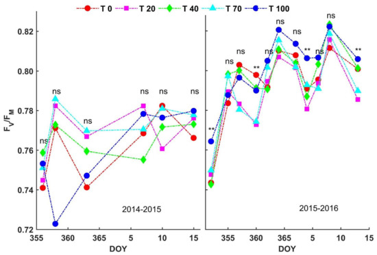 Maximum quantum yield (FV/FM) under five irrigation treatments (T): T0, T20, T40, T70, and T100 in 2014/2015 and 2015/2016 seasons. Each point represents the average of 16 measurements (4 quinoa genotypes and 4 replicates each). T and 0, 20, 40, 70, and 100 represent the levels of available water to the plant in a 0.6 m deep root zone just before irrigation. DOY is the day of year. **, measurement date indicating that significant differences were found. ns, measurement date indicating that no significant differences were found.