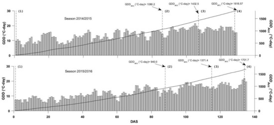 Daily growing degree-days (GDD, vertical bars) and cumulative growing degree-days (, in 2014/2015 and 2015/2016 seasons. DAS is days after sowing. Vertical thin lines indicate (1) sowing, (2) grain filling stage, (3) physiological maturity stage, and (4) harvest time. Sowing in the 2014/2015 season was on 5 October 2014; and sowing in the 2015/2016 season was on 20 September 2015.