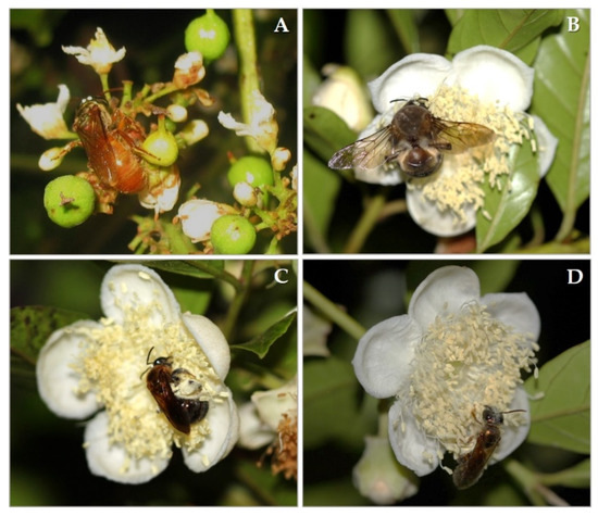 Our knowledge concerning crop pollination by nocturnal bees has increased recently (Table 1). Nocturnal bees have been recorded to be effective pollinators of regional crops in Brazil, such as cambuci (Campomanesia phaea-Myrtaceae), which are native to the Atlantic Forest, and guaraná (Paullinia cupana-Sapindaceae), native to the Amazon region. Both species are cultivated in their original habitat and both have regional economic importance [18,36,37,77]. Nocturnal bees most likely are pollinators of other Myrtaceae crops in the neotropics, for example of species in the genera Eugenia, Campomanesia, Myrcia, and Pisidium, which produce fleshy fruits. Flower opening before sunrise and an intense floral scent is common to all these species [18,38,39,59].