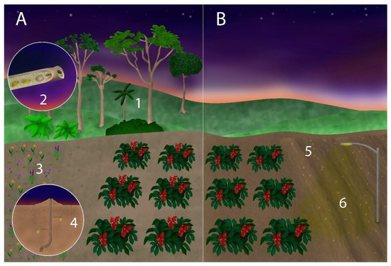 Comparing a more (A) and a less (B) sustainable crop area for hosting high numbers of nocturnal bee pollinators. Adjacent natural areas to provide food (1) and nest (2) resources; a range of cultivated, native flowering species offer food beyond the crop flowering season (3); potential nesting sites of ground-nesting species (e.g., Ptiloglossa) should be identified and protected (4); soil disturbance, such as that caused by deep tillage, fire, and superficial movements in the area by agricultural machines should be minimized, at least during the flowering season (5); artificial light pollution at night (ALAN) near crop areas should be avoided (6).