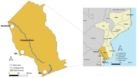 The Chókwè Irrigation Scheme (CIS) is located in southern Mozambique, in the Chókwè District, adjacent to the Limpopo River [,] (Figure 1). It is the largest irrigation scheme in the country [,], covering 33,000 ha of land []. Its production potential has not yet been achieved, and is hindered by an insufficient supply of irrigation water, excessively expensive chemical fertiliser, and moderately costly labour []. The total population living in Chókwè district is about 212,071 people, with 56% living in rural areas (INE, 2017). The climate of the region is semi-arid [], with an average annual temperature of 22–26 °C, and rainfall averaging between 500 and 700 mm/year [,]. The CIS is composed of three main hydraulic sectors: montante (upstream), sul (midstream), and rio (downstream) (Figure 1). The hydraulic structures in the irrigation scheme include the Massingir dam, Macarretane weir, and the main, secondary, and tertiary canals, as well as the drainage network [].
