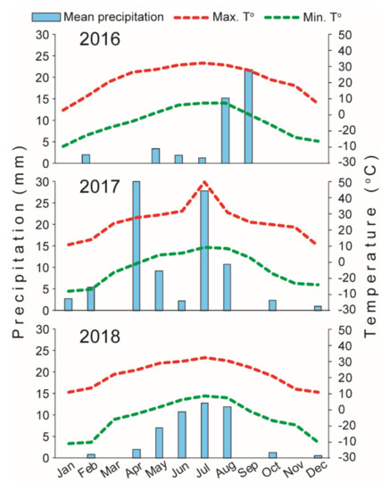 Monthly maximum and minimum temperatures, and precipitation for 2016, 2017, and 2018 at Cele Oasis of Tarim Basin of the Taklamakan Desert, Xinjian, China. Source: Centre for Hydrometeorological station at Cele.