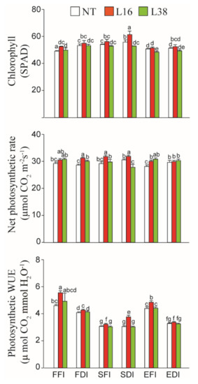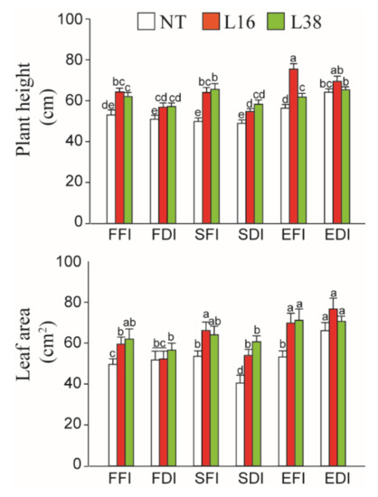 Plant height and leaf area for each irrigation treatment in 2016, 2017, and 2018 (Supplementary Table S3) with mixed model analysis. Full forecast irrigation (FFI); 75% of full forecast irrigation (FDI); full soil moisture irrigation (SFI); 75% of full soil moisture irrigation (SDI); full flood irrigation (EFI); 75% of full flood irrigation (EDI). Different letters indicate significant differences between transgenic lines and NT following Duncan’s multiple range tests at the 5% level of significance.