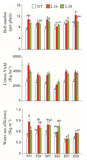 A number of bolls that highly depends on the number of pollinated flowers was significantly changed. Results indicated that the number of bolls per plant increased in all transgenic lines compared to NT under the different water treatments (Figure 5, Supplementary Table S3). Again, L16 demonstrated a significant higher boll number compared with NT in FFI, SFI, and EDI treatments, and L38 increased in FFI and SFI treatments.