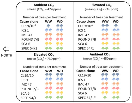 Genetic variation for a variety of physiological responses has been identified in cacao. Genotypic differences in net photosynthesis, canopy architecture, and biomass partitioning have been identified [15,16,17], as well as differential effects of temperature on chlorophyll fluorescence, chlorophyll content, fruit development, and bean quality [18,19]. Drought tolerance amongst cacao clones, along with various drought tolerance traits, has been identified [15,20,21,22,23,24,25,26]. So far, investigation of genotypic variation in response to CO2 has been very limited in cacao. Instantaneous net photosynthesis measurements in seedlings of three different genotypes exposed to increases in CO2 concentration showed significant increases in photosynthesis and decreases in stomatal conductance and transpiration, but no genetic differences in responses were reported [8,9]. The importance of the inclusion of genetic variation in physiological characteristics in response to environmental factors has been identified in various studies but has been under-utilised in breeding for climate resilience [27] and the development of climate change adaptation strategies [28]. This study builds upon a previous study of CO2 elevation and water deficit in juvenile seedlings [7]. We hypothesised that genetic variation in photosynthetic and growth responses to elevated CO2 and water deficit would be apparent. We also hypothesised that the vegetative growth response to elevated CO2 would be less pronounced in mature trees compared to seedlings due to the greater maintenance demands in older trees.