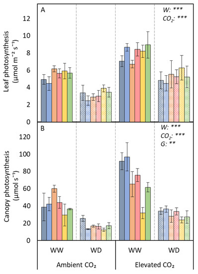 Leaf- (A) and canopy- (B) level photosynthesis measured on six genotypes of cacao grown at ambient and elevated CO2 under well-watered (WW) and water deficit (WD) conditions. Error bars are standard error of the mean. Grey bars: CL 19/10; blue bars: ICS 1, orange bars: IMC 47; pink bars: POUND 7/B; yellow bars: SCA 6; green bars: SPEC 54/1. Where statistical differences were identified between the main factors these are noted on the top right of each plot. The asterisks indicate the factors which had a significant effect on each response variable (W: water treatment; CO2: CO2 treatment; G: genotype; ** p < 0.01; *** p < 0.001).