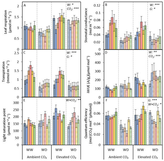 Photosynthetic responses of six different genotypes of cacao to elevated CO2 and water deficit (A–F). Error bars are standard error of the mean. Grey bars: CL 19/10; blue bars: ICS 1, orange bars: IMC 47; pink bars: POUND 7/B; yellow bars: SCA 6; green bars: SPEC 54/1. Where statistical differences were identified between the main factors these are noted on the top right of each plot. The asterisks indicate the factors and any interactions which had a significant effect on each response variable (W: water treatment; CO2: CO2 treatment; G: genotype; * p < 0.05; ** p < 0.01; *** p < 0.001).