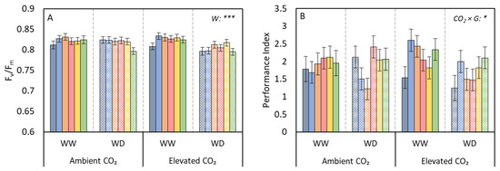 Maximum quantum efficiency of PS II (Fv/Fm) (A) and performance index (B) measured on six genotypes of cacao grown under well-watered (WW) and water deficit (WD) conditions in ambient and elevated CO2 conditions. Error bars are standard error of the mean. Grey bars: CL 19/10; blue bars: ICS 1, orange bars: IMC 47; pink bars; POUND 7/B; yellow bars: SCA 6; green bars: SPEC 54/1. Where statistical differences were identified between the main factors these are noted on the top right of each plot. The asterisks indicate the factors and interactions which had a significant effect on each response variable (W: water treatment; CO2: CO2 treatment; G: genotype; * p < 0.05; *** p < 0.001).