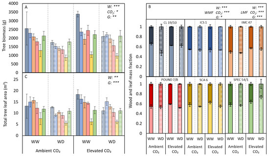 Tree biomass (A), wood and leaf mass fraction (B), and tree leaf area (C) in six genotypes of cocoa grown at elevated and ambient CO2 and under well-watered (WW) and water deficit (WD) conditions. In (C) wood mass fraction is shown in the lower stacked bar in the lighter colour shade, leaf mass fraction is shown in the upper stacked bar in the darker shade. Error bars are standard error of the mean. Grey bars: CL 19/10; blue bars: ICS 1, orange bars: IMC 47; pink bars: POUND 7/B; yellow bars: SCA 6; green bars: SPEC 54/1. Where statistical differences were identified between the main factors, these are noted on the top right of each plot. The asterisks indicate the factors which had a significant effect on each response variable (W: water treatment; CO2: CO2 treatment; G: genotype; * p < 0.05; ** p < 0.01; *** p < 0.001).
