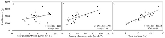 Relationships between total biomass and leaf-level net photosynthesis (A), canopy photosynthesis (B), and total leaf area (C). Final aboveground biomass was most strongly related to tree leaf area (C). Open circles: WW–ambient CO2, closed circles: WW–elevated CO2, open triangles: WD–ambient CO2, closed triangles: WD–elevated CO2.