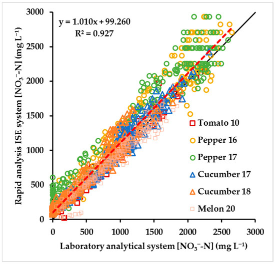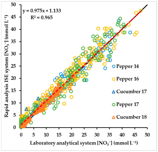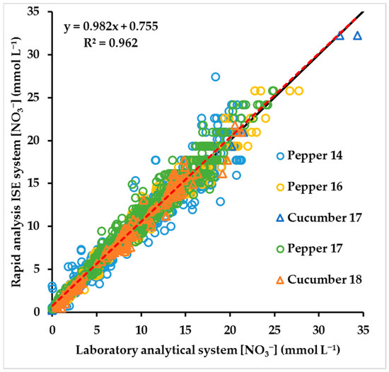 Nutrient solution. The relationship between [NO3−] measured with the rapid analysis ISE system and with a laboratory analytical system in 2010 different samples of nutrient solution obtained regularly throughout five different vegetable crops. The five crops were Pepper 14, Pepper 16, Cucumber 17, Pepper 17 and Cucumber 18. The dashed red line corresponds to the linear regression. The solid black line corresponds to the 1:1 linear relationship. The crops, their management and the two analytical systems are described in the Materials and Methods Section.