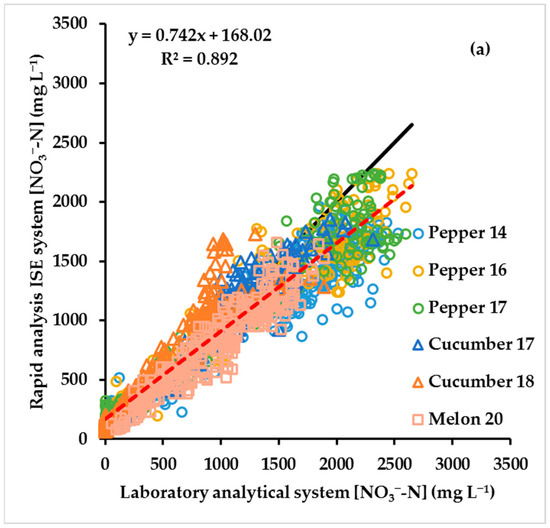 Soil solution. The relationship between [NO3−] measured with the rapid analysis ISE system and with a laboratory analytical system in 797 different samples of soil solution obtained regularly throughout five different vegetable crops. The five crops were Pepper 14, Pepper 16, Cucumber 17, Pepper 17 and Cucumber 18. The red dashed line is the linear regression equation between the two methods, and the solid black line is the 1:1 linear relationship. The crops, their management and the two analytical systems are described in the Materials and Methods Section.