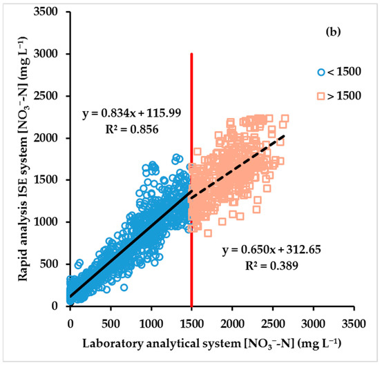 The overall relationship between [NO3−–N] measured with the rapid analysis ISE system in undiluted petiole sap compared to analysis with the laboratory analytical system, for 1425 samples collected throughout six different crops, was described by the relationship y = 0.742x + 168.02, with an R² of 0.892 (Figure 3a, Table 5). The slope of the linear regression equation was appreciably less than one. The use of two separate linear regression equations for each of the ranges of 0 to 1500 mg NO3−–N L−1 and 1500 to 2650 mg NO3−–N L−1 demonstrated improved agreement between the two methods up to 1500 mg NO3−–N L−1, with a slope closer to one (y = 0.834x + 115.99, R² = 0.856), and an appreciable and progressively larger underestimation at higher [NO3−–N] (y = 0.650x + 312.65, R² = 0.389) (Figure 3b).