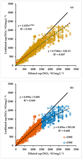 Undiluted and diluted petiole sap. The relationship between [NO3−–N] in undiluted and diluted petiole sap, measured with the rapid analysis system. There were 1106 equivalent samples of both undiluted and diluted sap, taken throughout five different crops. The five crops were Pepper 16, Pepper 17, Cucumber 17, Cucumber 18 and Melon 20. In panel (a), both a power and a linear regression equation were derived for the full range of concentrations measured in equivalent samples of undiluted and diluted petiole sap. The green dashed line represents the power equation and the dashed red the linear regression equation. In panel (b), linear regression equations were derived for each of the ranges 0–1500 and >1500 mg L−1 (as measured in diluted sap). The dashed black line corresponds to the linear regression for the range 0–1500 mg L−1, and the dotted black line corresponds to the linear regression for the range >1500 mg L−1. In both panels, the black unbroken line is the 1 to 1 line. The [NO3−–N] values for diluted samples, measured with the rapid analysis system, are presented as equivalent values for sap prior to dilution, as the product of the directly measured [NO3−–N] in the diluted sap multiplied by the dilution factor. The crops, their management and the rapid analysis system are described in the Materials and Methods Section.