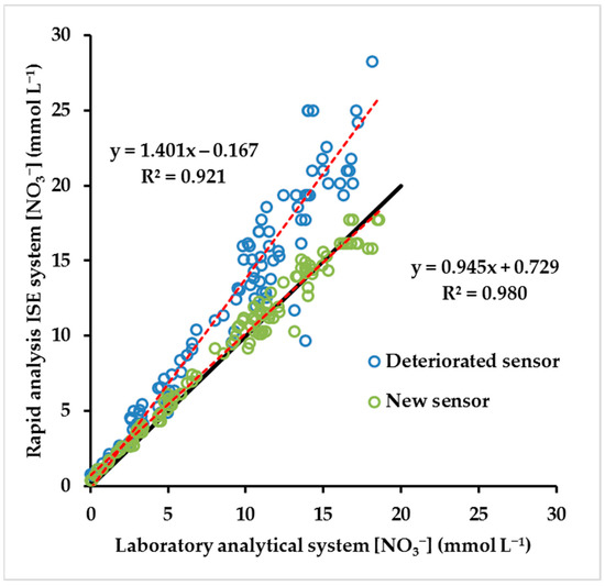 Measurement of [NO3−] in nutrient solution with a deteriorated sensor, through normal ongoing wear, resulted in appreciable overestimation and increased relative error compared to laboratory analysis (Figure 6). The relevant linear regression equation was y = 1.401x − 0.17, R2 = 0.921, which indicated an overestimation of approximately 40%. The relative error with the deteriorated sensor was 30% (data not presented). For the same model LAQUAtwin rapid analysis system with a new sensor, the linear regression of the relationship with laboratory analysis was y = 0.945x + 0.73, with an R2 = 0.980 (Figure 6), and a relative error of only 12% (data not presented).