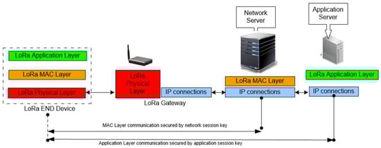 LoRa is a form of robust low-power wireless networking that is used for long-distance communication. LoRa utilizes chirp spread spectrum (CSS) modulation to modulate the Industrial, Scientific and Medical (ISM) bands []. Modulation of the chirp spread spectrum broadcasts a narrow band signal over broader channel bandwidth. LoRa operates on ISM bands such as 868 MHz in Europe, 995 MHz in North America, and 433 MHz in Asia []. LoRa can communicate over distances of between 10 and 40 km in rural areas, and urban area coverage is between 1 and 5 km. The LoRa protocol specification was developed by the LoRa Alliance, as shown in Figure 1. The LoRaWAN protocol comprises the MAC Layer and the Application Layer, and operates based on the LoRa physical layer. LoRaWAN is a network standard for telecom operators founded on the LoRa physical layer (PHY). It enables network services and encourages systems to transfer data to gateways wirelessly over a long range. LoRaWAN communicates between LoRa gateways and IoT devices via a star-network topology, and single hopping is allowed between a gateway and a LoRa device.