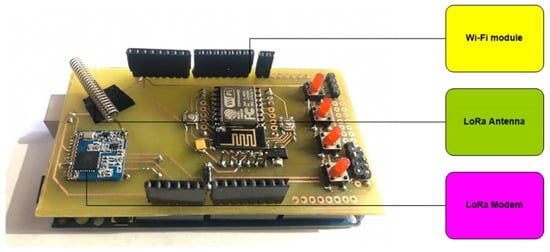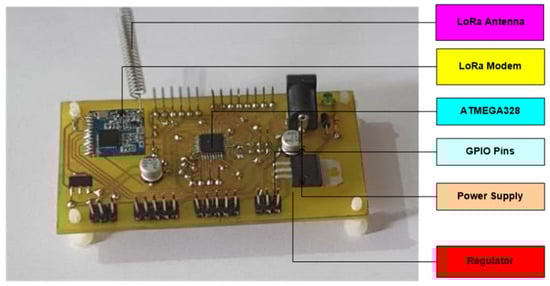 The sensors are interfaced and powered from the solar panel. All data is gathered at the sink node and is transmitted to the destination via a gateway. The hardware can be operated on a rechargeable Li-Ion 2200 mAH battery. Figure 3 consists of sensor modules, ADC, LoRa modem, and a LoRa helical antenna. The device can be deployed to collect sensor data from the field and transmit it via the Internet to the receiver device through the gateway, which is a customized ATMEGA 328 p board with an inbuilt Wi-Fi module and it is shown in the Figure 4.