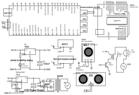A circuit diagram of a reference model of the interface connections made in real time is shown in Figure 5. Firstly, the Arduino is connected to the Raspberry Pi using a USB cable. The gas sensor is connected to the Arduino at the analog A0 pin. The ultrasonic sensor is connected to pin no. 9 of the Arduino for trigger, and echo at pin no. 10. DHT11 is connected to pin 2 of the Arduino. Soil moisture is connected to analog pin A3 of the Arduino. The motor pump is connected to pin no. 8 of the Arduino.