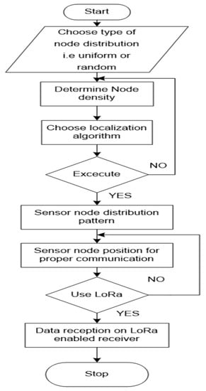 A flow diagram of the sensor node localization is illustrated in Figure 7. Initially, the type of node distribution is chosen as per the application, which may be uniform or random. Furthermore, node density is determined to check the number of nodes present in the area (measured in square meters). The algorithm computes these input data and results in sensor node distribution patterns. After confirming the communication link among the sensor nodes, a hybrid range-based localization technique was chosen because it is more effective. Localization is crucial to determine the sensor node target tracking location. Here, we first grouped the algorithms into free range-based and hybrid range-based. Furthermore, we analyzed the suitable localization techniques. Range free-based localization is preferred because of its low power consumption, whereas hybrid range-based localization is preferred depending on the applications. Because the land is not uniform in nature, hybrid range-based localization is widely preferred in agriculture. Most IoT-based applications require sensor node localization because these applications are easy and convenient to monitor. Simulation studies were carried out to compute the localization of algorithms. The effect of the node density, data rate, and signal strength was analyzed to develop the optimal algorithm for our application. Furthermore, we undertook a comparative analysis of the range-based agriculture applications, and concluded that range free-based localization was more suitable.