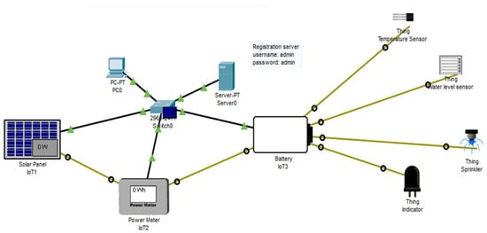In agriculture, sensor nodes are deployed in an outdoor environment. Moreover, the sensor node′s battery life represents a challenge because the life of the battery drains due to distinct environmental conditions. Thus, the optimal solution for implementing energy harvesting for sensor nodes involves renewable energy sources. Energy harvesting is the optimal mechanism used to power the activities of the sensor nodes, including sensing, preprocessing, and transferring data. The evaluation of sensor node battery life using solar panels and wind turbines was performed using a Cisco packet tracer. The Cisco packet tracer is a visualized-based simulation tool that encourages the user to implement distinct network-based simulations. The simulation model for evaluating the sensor node′s energy through solar panels and wind turbine was implemented in the Cisco packet tracer environment and is shown in Figure 8.