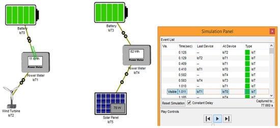 The lifetime of the nodes is presented in the simulation, as shown in Figure 10. Data transmission occurs from end nodes to the hub, the hub to a central server, and from mobile phones via cell towers. The simulation panel in Figure 9 presents the number of IoT devices connected to the network. Each renewable resource is connected using a power meter for calculating the power consumption. Timestamp details of the IoT devices are represented in the time column; the IoT 2 device is connected to the network with a time of 0.129 s. Devices IoT0 and IoT1 are currently connected within 1.011 s. Total device connection time is 77.660 s with a specific time gap or delay. Further power is transferred to the battery for storage purposes. A sample scenario of power of 11 kWh in the case of a turbine and 78 watts with 82 Wh was considered.