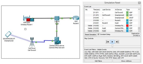 The establishment of LoRa-based communication from the sensor node to the mobile phone is presented in Figure 10. The simulation model shown in Figure 8 signifies the communication link established among sensor end nodes and establishes a connection with the gateway to transmit the data to the central server. In the simulation panel, the data transmission time in seconds, from the router to the hub and the hub to smartphones, is displayed. The simulation signifies the on-air data transmission. Three events are noted as having a time of 218.952 s. Each of the three devices, i.e., wireless router, central office, and another wireless router, connected to the network at the same timestamp. This signifies, in LoRa communication, that the device synchronization time gap is extremely small, which is an additional advantage. As soon as the authentication key matches, the devices are synchronized and begin communicating.