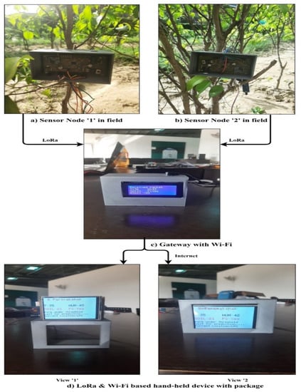 The Internet of Things (IoT) is a pioneering technology that provides an efficient and accurate automation solution for modernizing agriculture with minimal human interference []. The advancement of sensor technology, wireless communication technologies, and remote sensing technologies encourages precision agriculture (PA). In the attempt to enhance the yield and quality of crops, wireless transmission is necessary to transfer data to information processing centers. Wireless communication empowers the effective utilization of limited resources in agriculture, thereby allowing the development of agriculture in terms of reliable connectivity []. Generally, most agricultural fields are located in remote areas, where internet connectivity is unstable. To overcome these limitations, the implementation of a wireless sensor network (WSN) is required. In a WSN, open-licensed band communication protocols are embedded in the sensor node and the communication protocol for transmitting the agricultural field data to an area in which the internet connectivity is sufficiently strong to allow communication with the cloud server [].