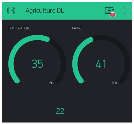 Moreover, a hand-held device (or portable device) was also designed and implemented in real-time scenarios, shown in Figure 16d. This hand-held device will assist farmers in checking the field from a remote location and is easy to use. A hand-held device integrates LoRa communication and an ESP 8266 Wi-Fi module. These two communication modules assist in receiving the crop data regarding from the sensor node and gateway. The hand-held device is used to visualize the data of the crop field on a color LCD. The hand-held device shows the sensory data, including temperature, humidity, soil moisture, and fire detection. The gateway node logs the data on the cloud server through the Internet. Here, we used the Blynk cloud server to record the sensory data of the sensor node. The data regarding temperature and humidity can be seen in the Blynk dashboard, and is presented in Figure 17.