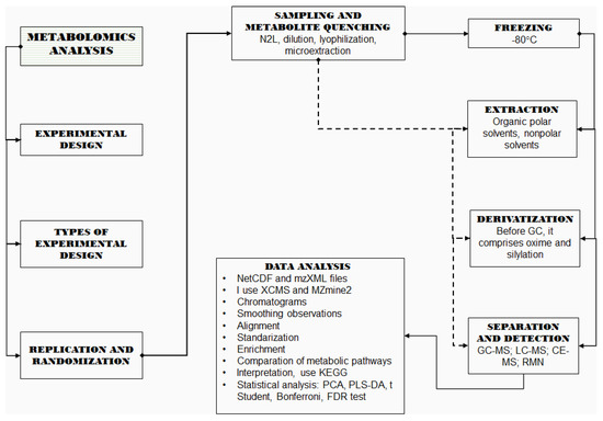 Differentially accumulated metabolites can be used for assessing significantly affected pathways. A complete metabolic pathway analysis usually includes the observation of interactions between genes, proteins, and metabolites within cells, tissues, or organs under a biological treatment [134]. Thus, the metabolomic data acquired is usually added to transcriptomic and proteomic data to obtain a complete perception of the biological processes [135]. However, metabolites alone can also provide pathway-related information thanks to the development of databases such as the Kyoto Encyclopedia of Genes and Genome (KEGG) which is able to map metabolites into pathways [136]. Metabolic pathways can be assessed from metabolomic data by overrepresentation analysis (OA). In an OA, detected metabolites are mapped in potential pathways and the statistical significance of each pathway is determined by incorporating the number of differentially accumulated metabolites in a Fisher’s exact test or hypergeometric test [137]. Metabolite enrichment and pathway studies are done using ad-hoc software to connect significant metabolites to biochemical pathways using KEGG or other public databases [138]. The various methods and software used for metabolite-based pathway analysis were reviewed elsewhere [137]. Some examples of KEGG usage are cited below [132], analyzed the metabolomic profile of two cytotypes of Solidago canadensis, once the differentiated metabolites were obtained, they used KEGG to find the significant metabolic pathways such as “diterpenoid, phenylpropanoid biosynthesis” as well as “flavone and flavonol and flavonoid biosynthesis”. In the same field [139], they employed KEGG to map the metabolic pathways involved in the biosynthesis of rotenoids from Mirabilis himalaic; the main metabolic pathway was that of amino acids, especially phenylalanine, methionine and cysteine [65], used the KEGG platform to identify the metabolic pathways related, to differential metabolites obtained from roots and leaves, generated by drought in seven species of Triticeae, the metabolic pathway identified was TCA, especially succinate. Currently, metabolomic studies follow a sequence of steps (Figure 1) to provide broad and deep explanations of the biochemistry of an organism.