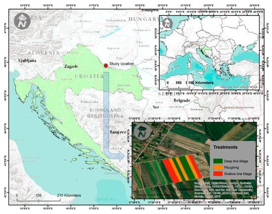 The tillage experiment was set up on the border of Lukač (45°55′ N; 17°29′ E, 103 m a.s.l.) in the Pannonian region (Virovitica-Drava county) between 2015 and 2018 (Figure 1). The area is mostly flat, with slope between 0° and 2° and land use cover was dominantly under croplands. The soil on experimental field belongs to Luvic Stagnosol (Siltic) with a silt loam texture [] (IUSS Working Group WRB, 2015). According to depths, at depth 0–15 cm, soil is silty loam (28.8% sand, 49.5% silt and 21.7% clay), pH (H2O) 7.8 and organic carbon content is 2.23%, while at 15–30 cm depth, soil is silty loam (27.7% sand, 50.8% silt and 21.5% clay), pH (H2O) 8.0 and organic carbon 1.48%.