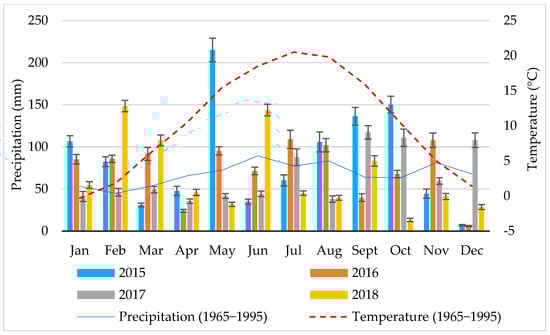 Monthly average precipitation and temperature between 2015 and 2018 and the long-term monthly average 1965–1995.