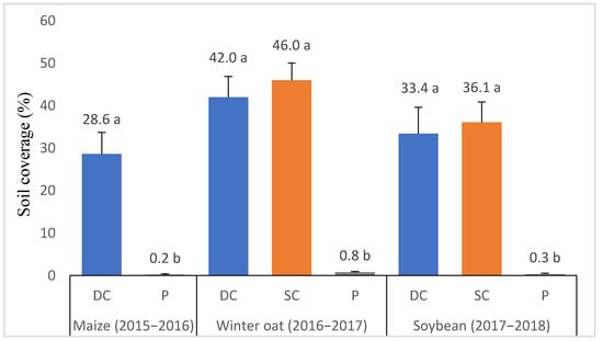 A soil cover (%) under tillage treatments. Hanging bars represent standard deviation. Different lowercase letters indicate significant difference (p < 0.05) between treatments in each studied season. Abbreviations: P, ploughing; DC, deep tine tillage; SC, shallow tine tillage.