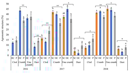 Average ratios of agronomic structure through three years (2016–2018). Treatments: P—ploughing; DC—deep tine cultivation; SC—shallow tine cultivation. The different lowercase letters above the columns indicate a significant difference, ** p < 0.01; * p < 0.05. Hanging bars represent standard deviation.