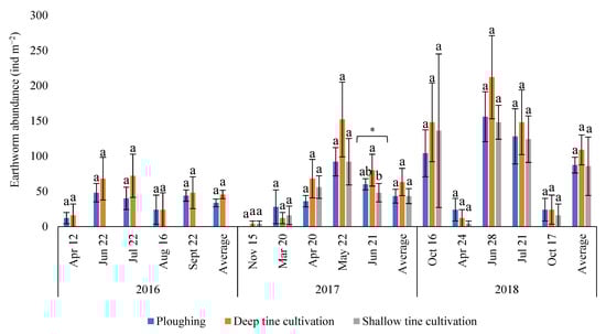 Earthworm abundance under different tillage treatments (2016–2018). The different lowercase letters above the columns indicate a significant difference at * p < 0.05. Hanging bars represent standard deviation.