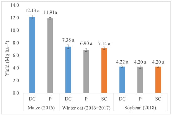 The yields are presented in Mg ha−1 at dry moisture content. In 2016, the greatest maize yield was detected in DC (12.13 Mg ha−1), followed by P (11.91 Mg ha−1) (Figure 6). In 2017, DC reached the highest yield (7.38 Mg ha−1), followed by SC (7.14 Mg ha−1) and P (6.90 Mg ha−1). After soybean harvest in 2018, there was no significant difference in yields between SC and P (4.20 Mg ha−1), while imperceptibly higher yield was obtained in DC (4.22 Mg ha−1). DC achieved the highest yields each year, while P reached the lowest or it was equal to SC.