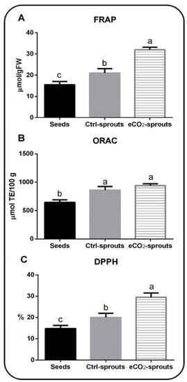 The antioxidant capacity of control seeds, control (ambient CO2-exposed) sprouts, and elevated CO2 (eCO2)-treated sprouts of Trachyspermum ammi represented by (A) ferric reducing antioxidant power (FRAP), (B) oxygen radical absorbance capacity (ORAC), and (C) DPPH. Data are represented by means ± standard deviations of at least 4 replicates. Different a, b, c letters above bars indicate significant differences between means at p < 0.05.