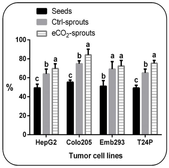 In vitro cytotoxicity of control seeds, control (ambient CO2-exposed) sprouts, and elevated CO2 (eCO2)-treated sprouts of Trachyspermum ammi against human cancer cell lines including hepatocellular carcinoma (HepG2), colon carcinoma (Colo205), embryonic kidney adenocarcinoma (Emb293), and urinary bladder carcinoma (T24P). Data are represented by means ± standard deviations of at least 4 replicates. Different a, b, c letters above bars within each cell line indicate significant differences between means at p < 0.05.